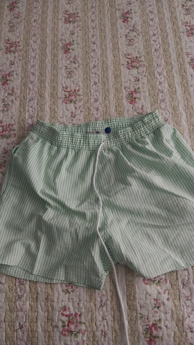Pastel yeşil renkli, pileli ve bol kesim erkek plaj şortu, sokak stili ve plaj için uygundur.