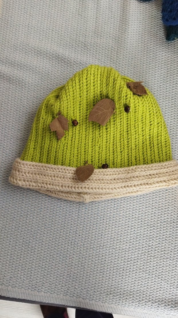 Pastel yeşil örgü kadın bere, rahat dokusu ve yaprak detaylarıyla trend ve avangart bir tarz sunar.