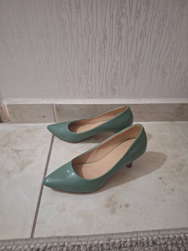 Yeşil pastel renkte, lastik malzemeden yapılmış ve desensiz stilettolar. Ofis için uygun, klasik şıklık ve zahmetsiz zarafet sunar.