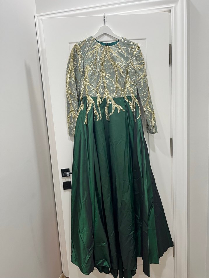 Uzun yeşil abiye, bol kesim,alt kısmı tafta kumaş,üstü payetli işlemeli tesettür ve özel güne uygun elbise.42 beden uyumlu,özel dikim.