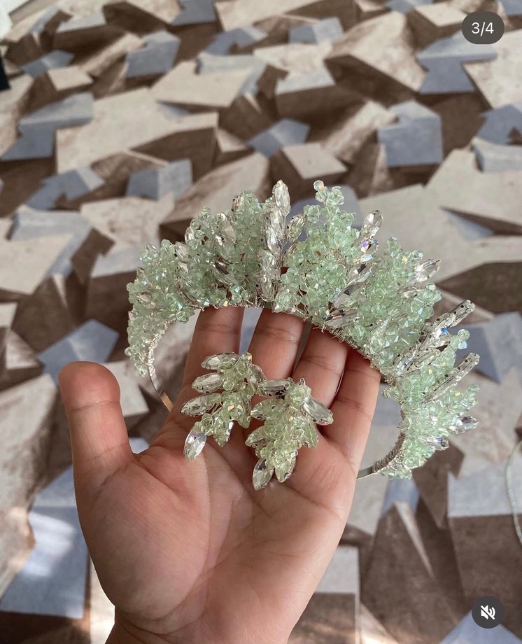 Yeşil payetlerle süslenmiş bohem tarzda gelin tacı ve küpe seti, göz alıcı ve modaya uygun bir görünüm sunar.