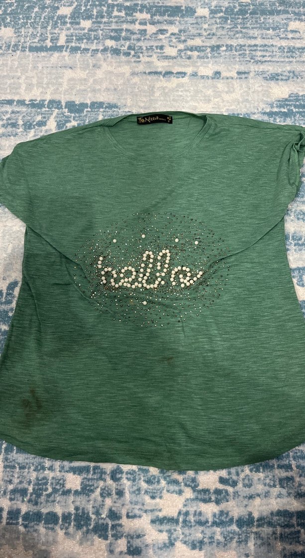 Yeşil renkte, kısa kollu ve yuvarlak yakalı, bol kesim kadın tişörtü. Önünde parlak payetlerle süslenmiş 'hello' baskısı bulunur, rahat sentetik kumaştandır.