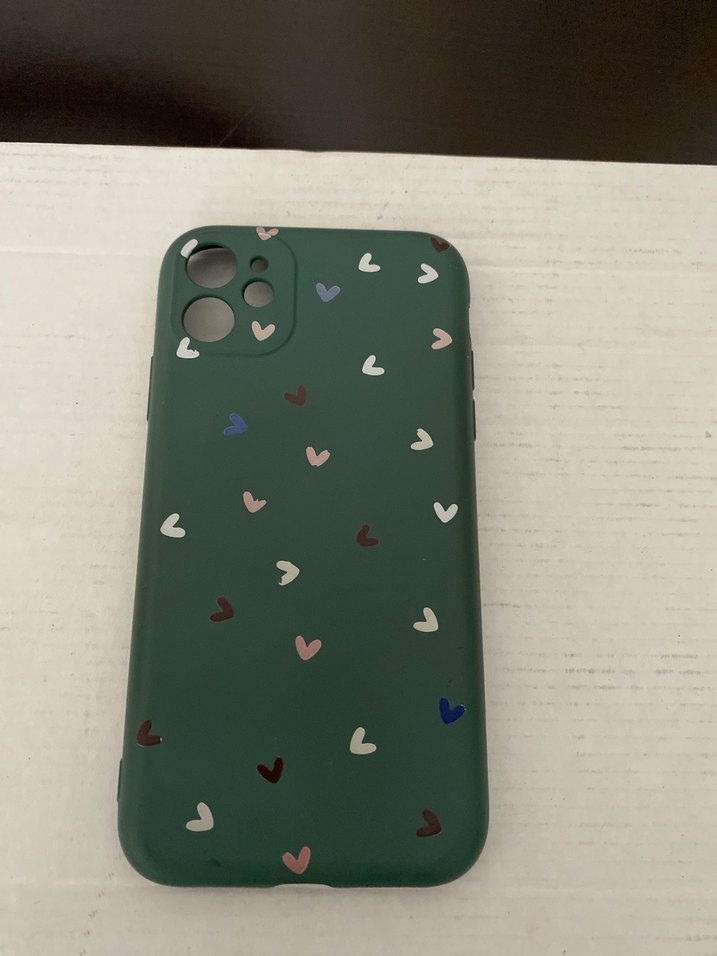 Küçük payetli kalp desenleriyle bohem tarzda koyu yeşil telefon kılıfı. Benzersiz ve dekoratif bir görünüm sunar. İphone 11