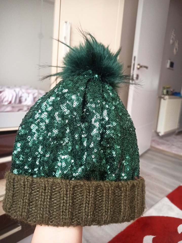 Yeşil payetlerle süslenmiş, yumuşak ponponlu örgü kadın bere, rahat ve bohem sokak stilini yansıtıyor. isil isil bir sapka.kullanilmamistir
