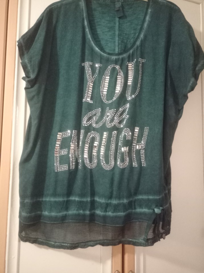Kısa kollu, rahat kesim yeşil keten tişört. Üzerinde 'YOU are ENOUGH' yazılı parlak payetli baskı bulunur. Rock punk tarzında şık bir parça. ✨44 46 bedene uygundur
