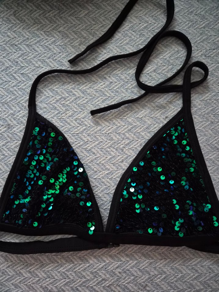 Sıkı kesim yeşil payetli ve işlemeli, askılı mini bikini üstü, gösterişli parti tarzı için uygun. ✨ 36-38