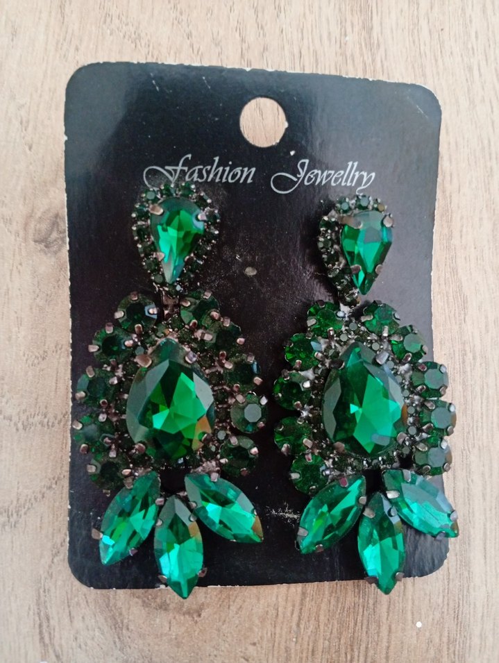 Uzun boy, yeşil payetli ve desenli bohem tarzda küpeler, düğünler için uygundur. Parlak ve retro havası vardır.