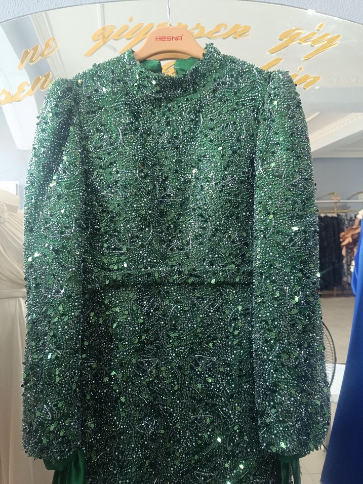 46-48 uyumludur Yeşil, uzun kollu ve bisiklet yaka tasarıma sahip bu abiye elbise, payetlerle süslenmiş desenli kumaftan üretilmiştir. Düğün ve özel günler için göz alıcı ve şık bir tercihtir. ✨