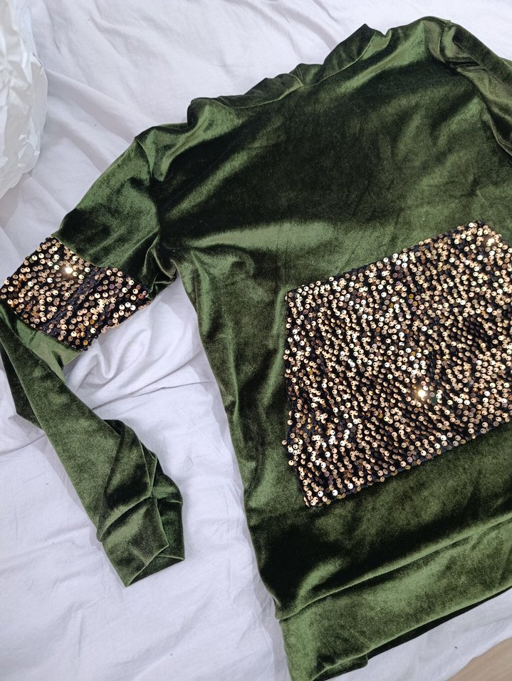 Kadife kumaş kapşonlu ön payet cep detaylı. Etiketin de XL beden yazıyor ama standart kalp dar kesim