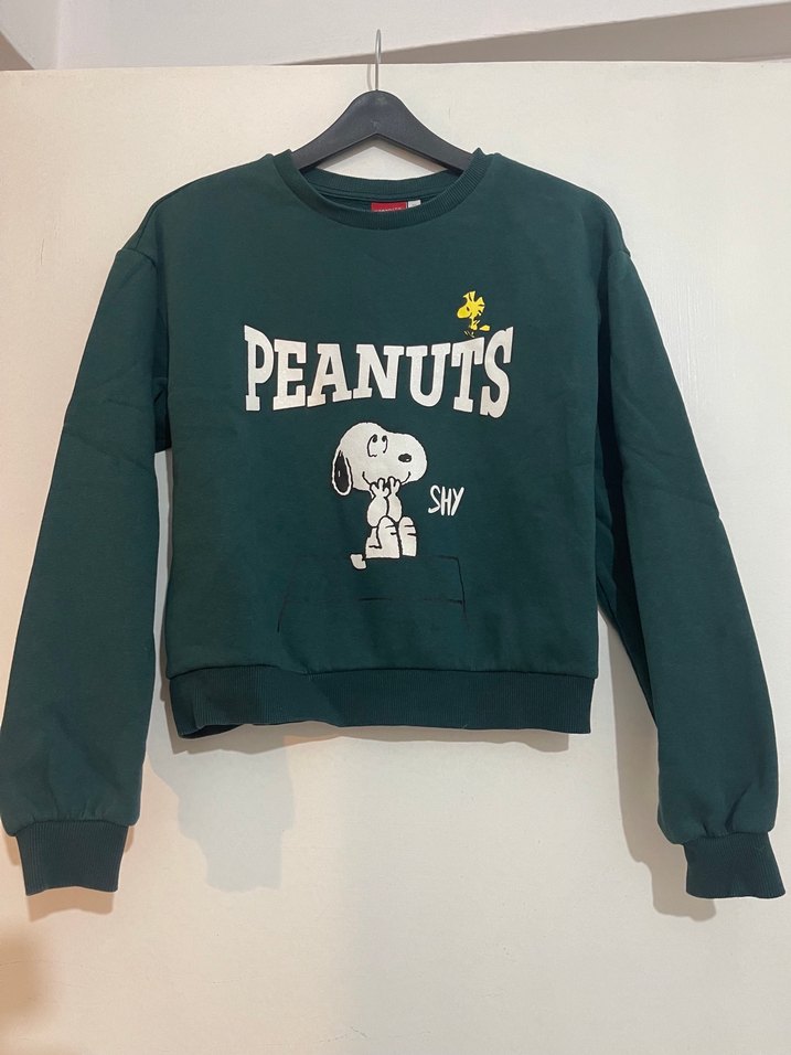 Uzun kollu, yuvarlak yakalı koyu yeşil sweatshirt. Peanuts baskılı, yumuşak ve rahat kumaştan, kısa ve bol kesim.
