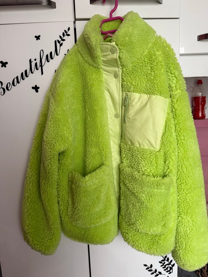 Yeşil peluş kumaştan, yüksek yakalı ve bol kesimli midi ceket. Kürk detaylı ve cepli, rahat sokak stili için uygun. Ürün hiç bir şekilde kullanılmamıştır