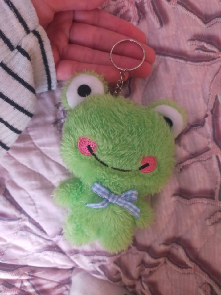 Yumuşak ve renkli yeşil peluş kurbağa anahtarlık, gülen yüzü ve mavi fiyonkuyla anahtarlarınıza sevimli bir dokunuş katar.