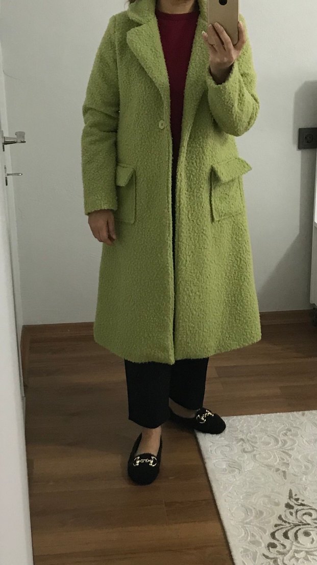 Pastel yeşil renkli, bol kesim ve uzun kollu kadın kabanı. Kürklü detaylara ve kesik yaka yakaya sahip, yumuşak ve rahat kumaştan üretilmiştir.