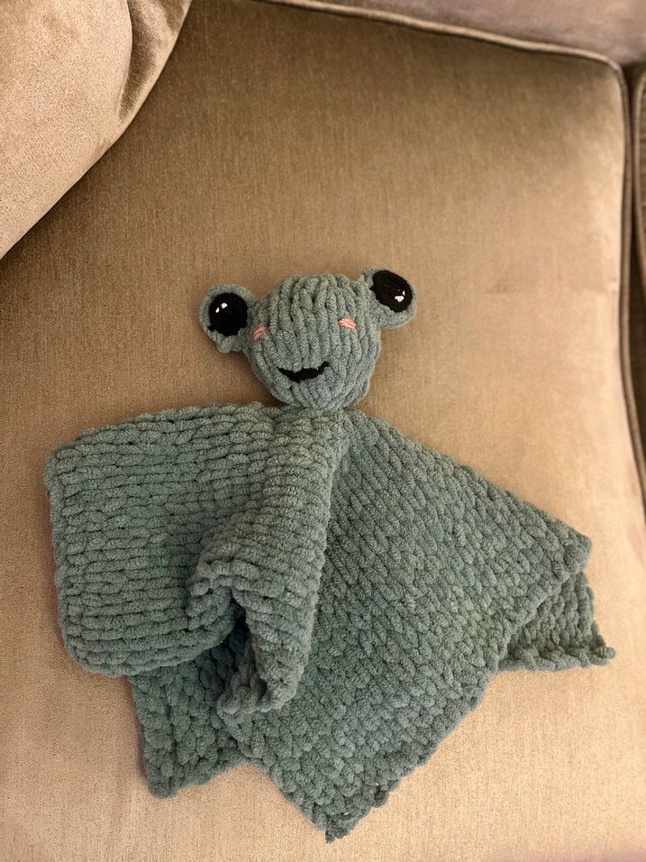 Yumuşak dokulu, yeşil renkte peluş oyuncak, büyük gözlü ve gülümseyen yüzüyle sarılmak için uygun.
