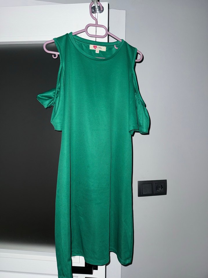 Yeşil, parlak sentetik kumaştan yapılmış, mini elbise. Bisiklet yaka, günlük sokak stiline ve denize gitmeye de uygun, orijinal marka tam beden. Boyu 82cm. Son iki fotoda belli olan ön ve arka tarafında ip çekmeleri var o yüzden uygun koyuyorum
