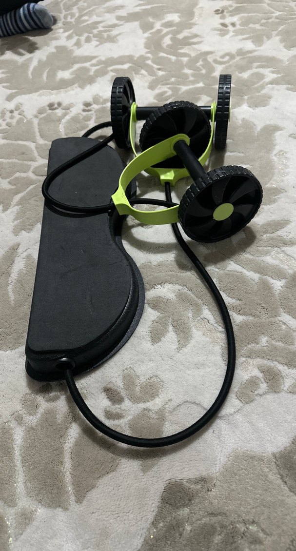 Koyu yeşil renkte, desenli pilates bandı ve tekerlekli egzersiz aleti, core gücünü ve esnekliği artırmak için kullanılır. ️