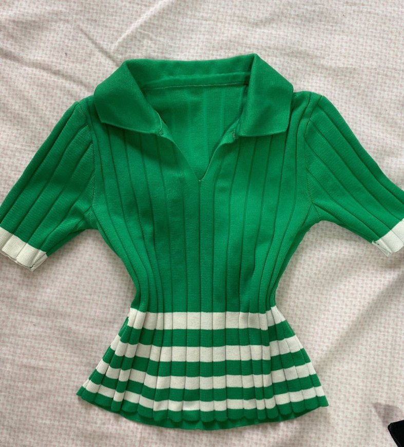 Fitted kesim, uzun kollu yeşil triko, yakalı ve bel kısmında beyaz çizgili pileli detaylara sahip, günlük kullanıma uygun renkli ve şık.
