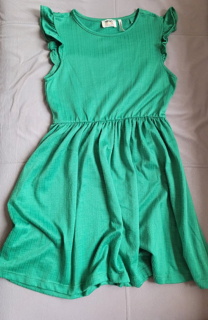 Yeşil renkli, pile detaylı, kolsuz kız çocuk elbisesi. Parlak sentetik kumaştan, oturan kesimli ve bisiklet yaka modelinde, sade bohem tarzda.