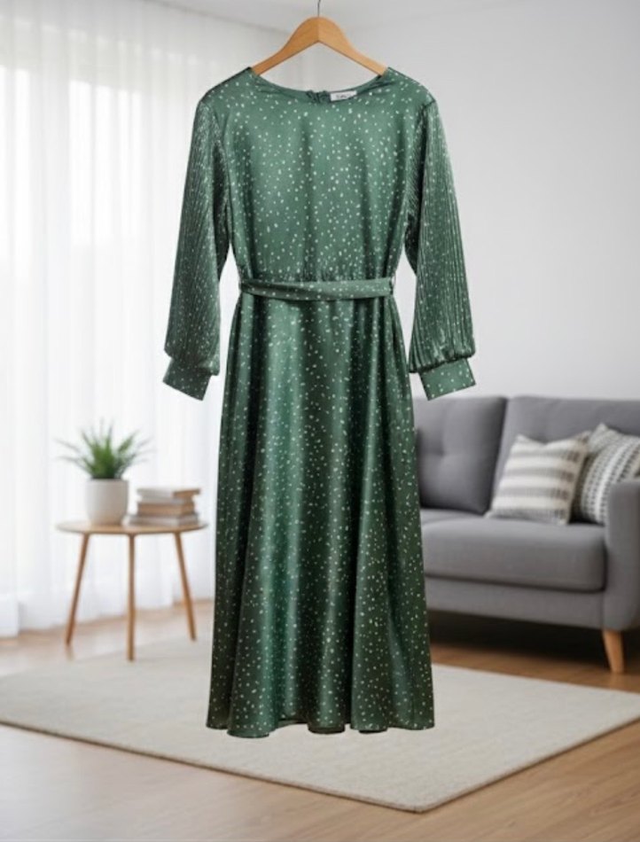 Yeşil Pileli Uzun Elbise V Yaka