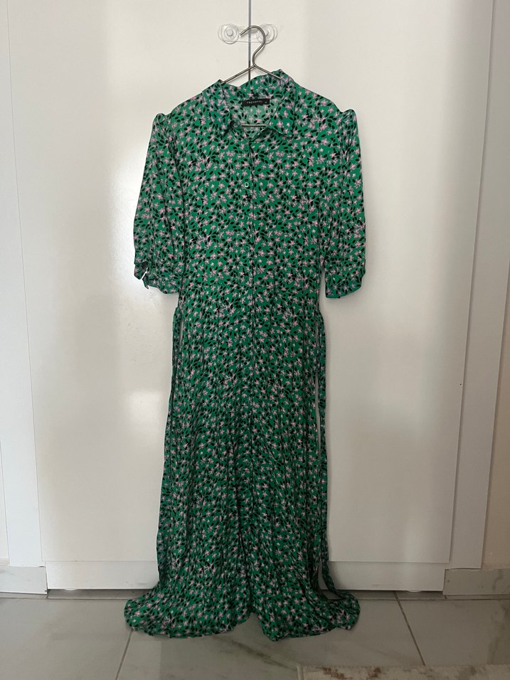 Yeşil renkli, pileli ve yakalı uzun kadın elbisesi. Kısa kollu, bol kesim ve bağlama desenli, yumuşak sentetik kumaştan yapılmıştır.