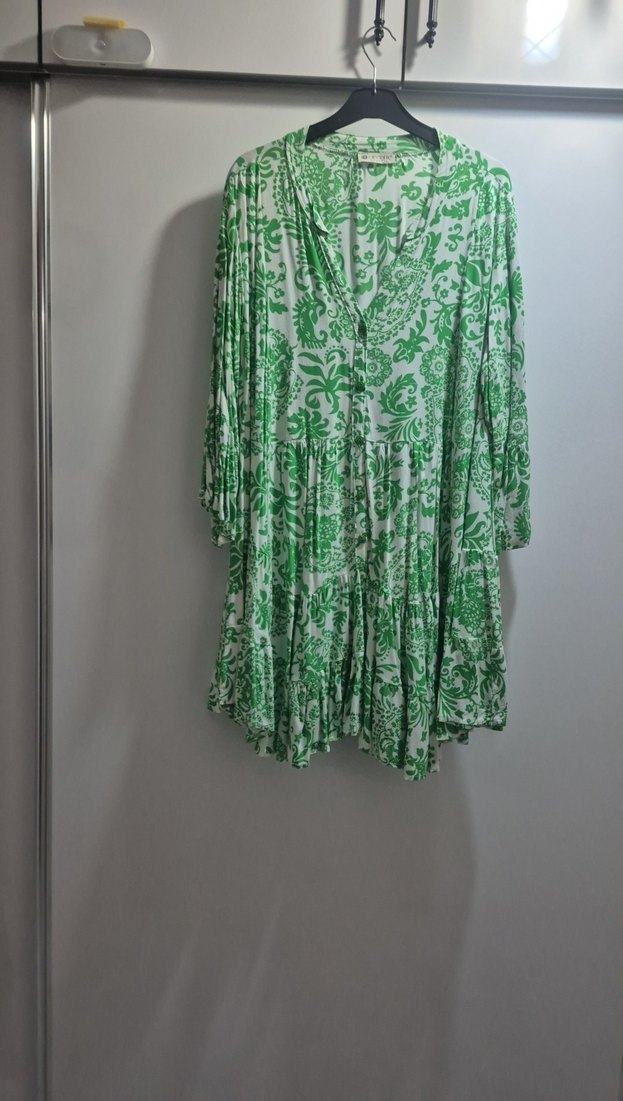 Yeşil renkli, pilili detaylı ve V yakalı uzun elbise. Yumuşak sentetik kumaştan, bol kesim ve uzun kolludur. Hafif batik desenli, bohem stil için uygun.