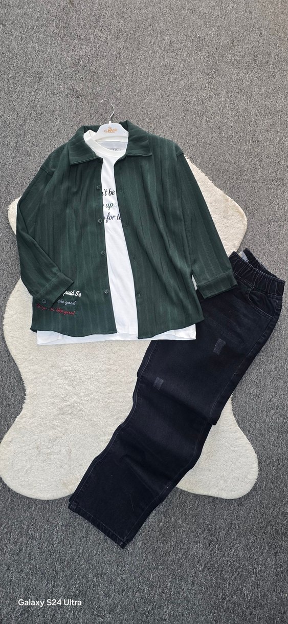 Koyu yeşil pilili ve bol kesimli, gomlek tshırt pantolon. Günlük kullanım için uygun, desen içermeyen rahat bir sokak stili ürünüdür. 5/6 7/8 9/10 11/12 yasları mevcuttur