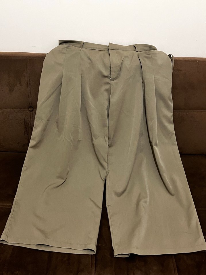 Yeşil renkli, midi boy, pilili ve bol kesim kadın pantolonu, yumuşak ve ipeksi kumaştan üretilmiştir. Minimalist tarzda günlük kullanıma uygundur.