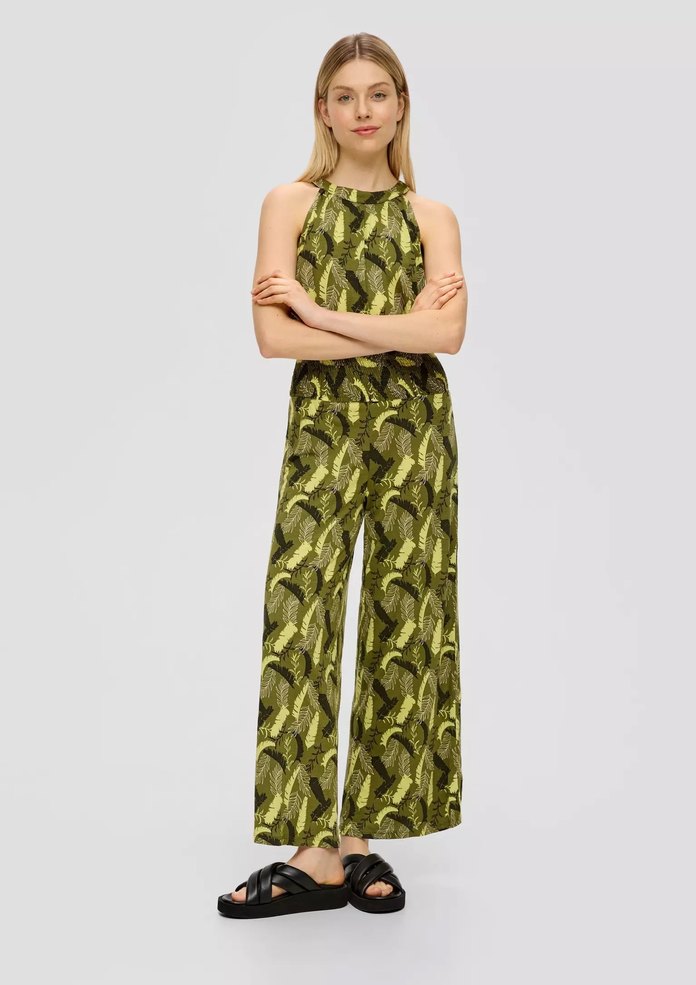 Kolsuz, yüksek yakalı ve parlak yeşil tie-dye desenli kadın tulumu. Düzenli kesim, pilili ve midi boyda, sentetik kumaştan günlük kullanım için uygun.
