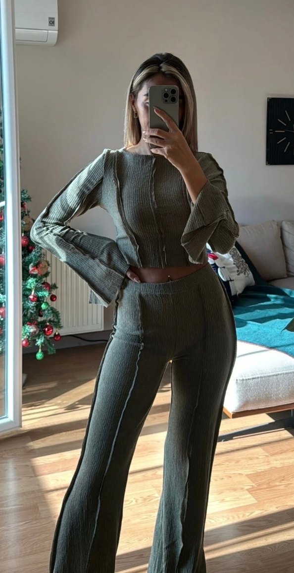 Pilili detaylı uzun kollu, yüksek yakalı yeşil renkli, günlük kullanıma uygun, dar kesim kadın takımı.