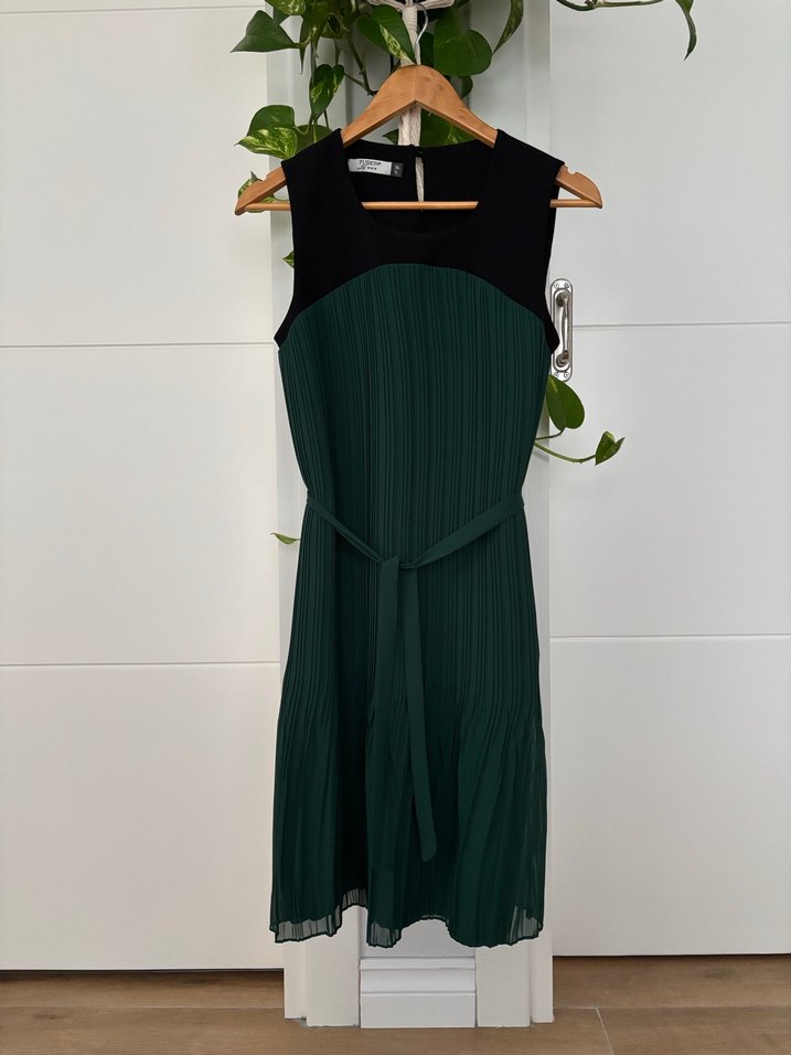 Yeşil renkli, pilili ve kolsuz midi elbise. Ofis ortamı ve günlük kullanım için uygundur.