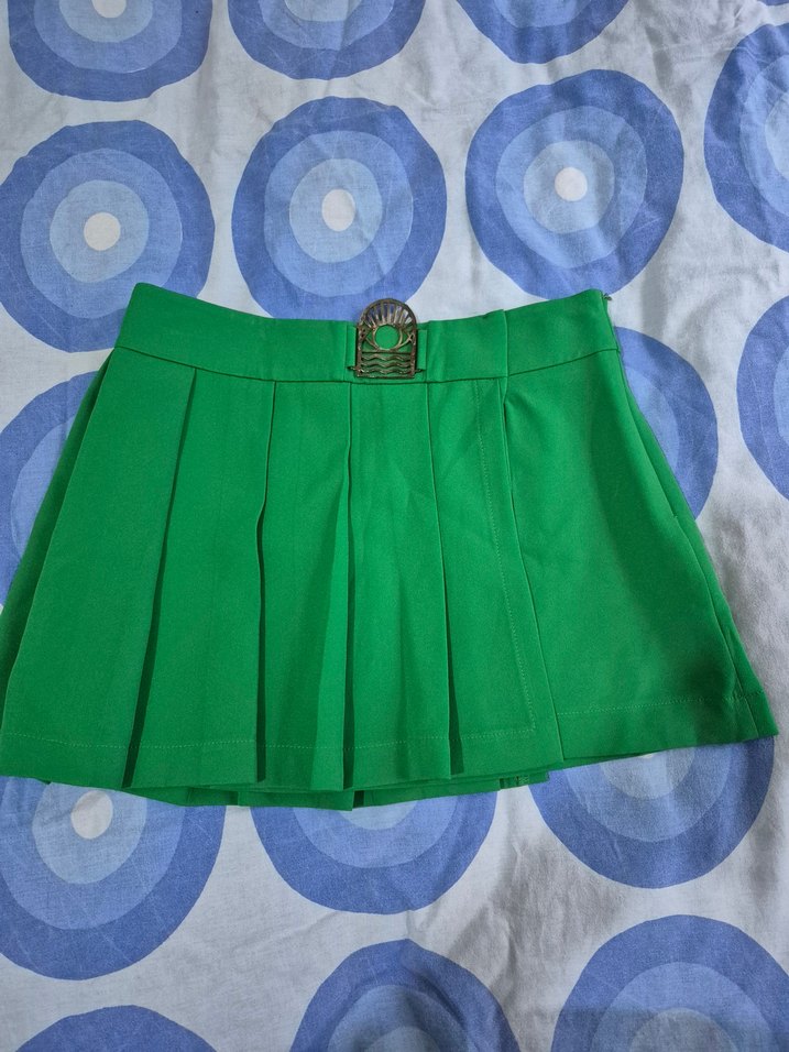Yeşil renkli, pilili ve oturan kesime sahip mini etek. Sentetik kumaştan yapılmıştır ve minimalist, renkli bir stile sahiptir.