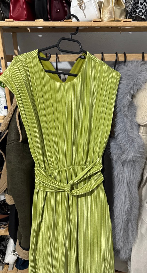 Kolsuz, V yakalı, pilili ve parlak yeşil sentetik kumaştan uzun, bohem tarzda kadın elbisesi. Belde kemer detayıyla şekillendirilmiştir. Bir kere giydim