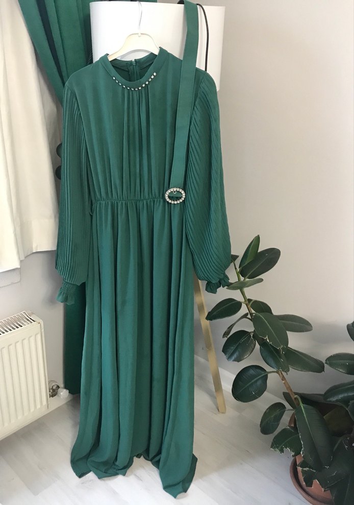 Yeşil Pilili Uzun Kadın Abiye Elbise