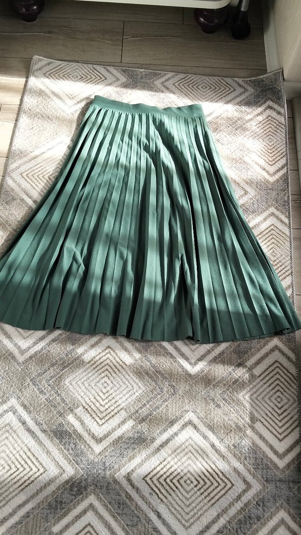 Sentetik kumaştan yapılmış, pilili ve bol kesim yeşil midi boy etek, bohem tarzı için uygundur. hiç giyilmemiştir etiket üstünde 36 38 beden