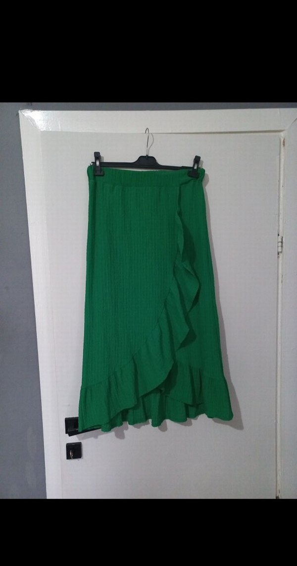Yeşil pilili uzun etek, yumuşak sentetik kumaştan, bol kesim ve minimalist tarzda günlük sokak giyimine uygundur.