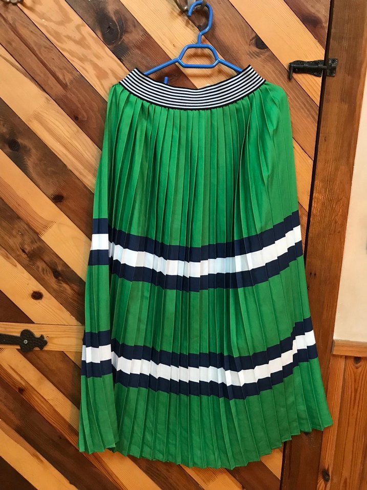 Renkli yeşil pilili uzun etek, sentetik kumaştan, geniş kesim ve çizgili desenlerle bohem sokak stili için uygun.