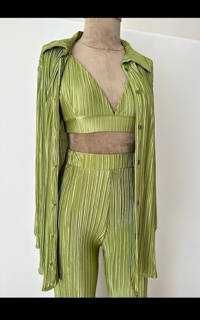 Pilili saten kumaştan yapılmış, yeşil renkli, uzun ve bol kesimli kadın gömleği. Uzun kollu ve yakası notched lapel tarzında. Parlak ve desensiz tasarım.