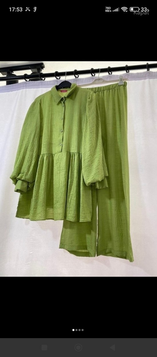 Kadınlar için uzun kollu, bol kesim ve pilili yeşil keten tunik. Notlu yaka detayı ve parlak renkli, bohem tarzda bir model.
