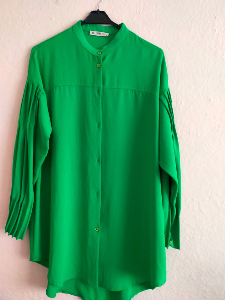 İpeksi kumaştan, pilili detaylı, uzun kollu ve bol kesim yeşil gömlek. Yuvarlak yaka ve uzun boy ile bohem tarzı için uygun. ürün yenidir hiç giyilmedi ürünü geçen yıl indirimden 2 âdet farklı renk aldım bu rengi hiç giymedim oyuzden satılıktır 2 koltuk arası genişlik 54 santimdir uzunluğu 80 santimdir kumaşi dokusu çok güzeldir kalitelidir internet sitesi üzerinden aldım Zümra eşarp sitesi üzerinden aldım oldukça kalitelidir rahattır
