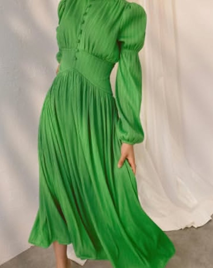 Parlak yeşil renkli, pilili ve bol kesim uzun elbise. Uzun kollu, düğmeli ve yuvarlak yakalı, ofis için uygundur.