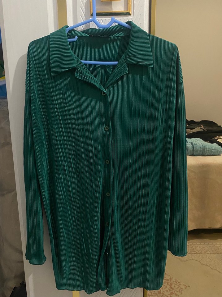 Yeşil Pilili Uzun Kollu Kadın Gömlek