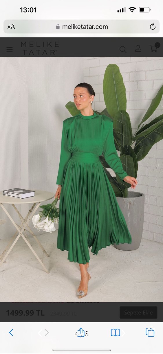 Yüksek yakalı, uzun kollu yeşil elbise, parlak ve ipeksi kumaştan, bol kesim ve pilili tasarıma sahiptir. Düğünler için uygundur. Melike tatar ürünüdür 1 defa kullandım