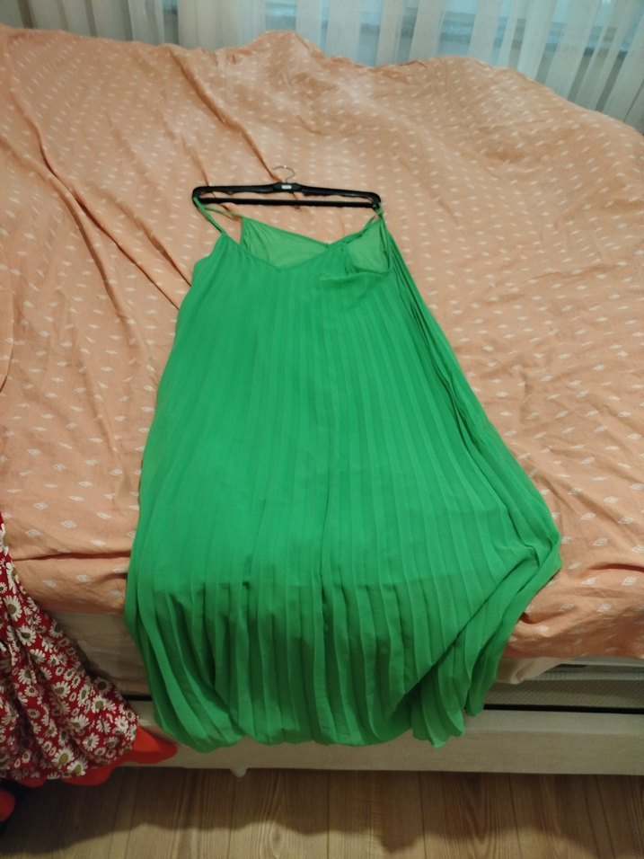 Yeşil renkli, pilili uzun straplez elbise, bol kesim ve yumuşak sentetik kumaştan üretilmiştir. Bohem ve retro tarzlar için uygundur, partiye idealdir.