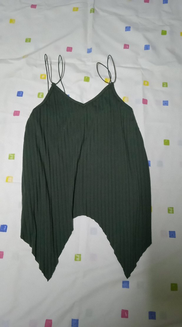 Kolsuz, yeşil pilili ve V yakalı bu bluz, bol kesim ve midi boydadır. Sentetik kumaştan, gündelik ve avangart tarz için uygundur.