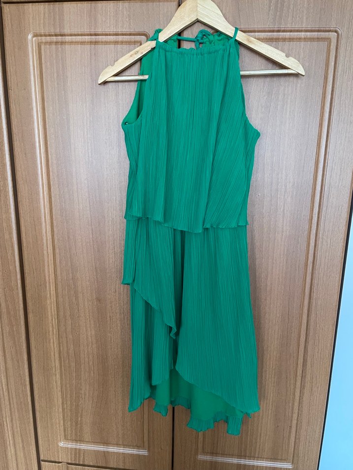 Yeşil renkli, piliseli, kolsuz elbise. Yüksek yakalı, vücuda oturan kesimiyle parlak sentetik kumaştan yapılmıştır. Minimalist bohem tarzında, parti için uygundur.