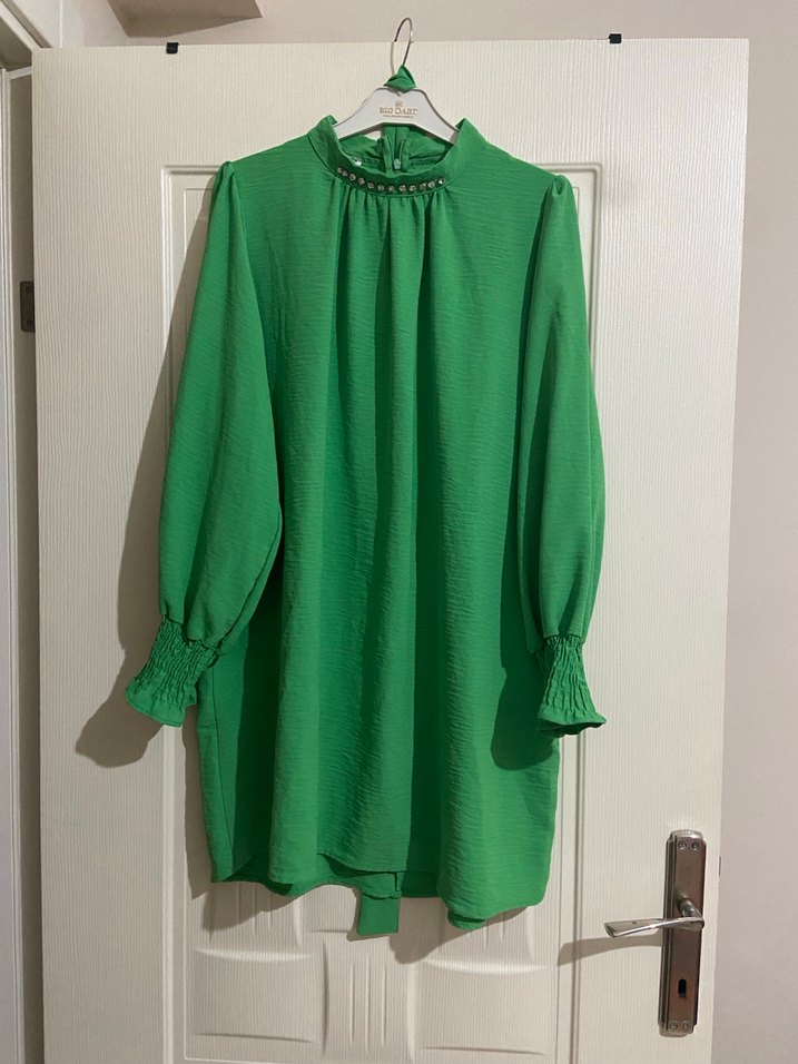 Yeşil renkte, yüksek yakalı ve piliseli uzun kollu tunik. Rahat kesimi ve yumuşak keten kumaş Belinde kusağı mevcuttur hiçbir defosu yoktur