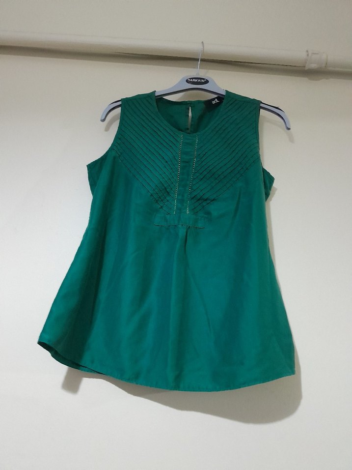Yeşil renkli, kolsuz ve piliseli ön detaylı kadın bluzu. Normal boyda, bol kesim ve parlak görünümlü, sentetik kumaştan yapılmıştır. iki kol arası 40 santim boy uzunluğu 60 santim