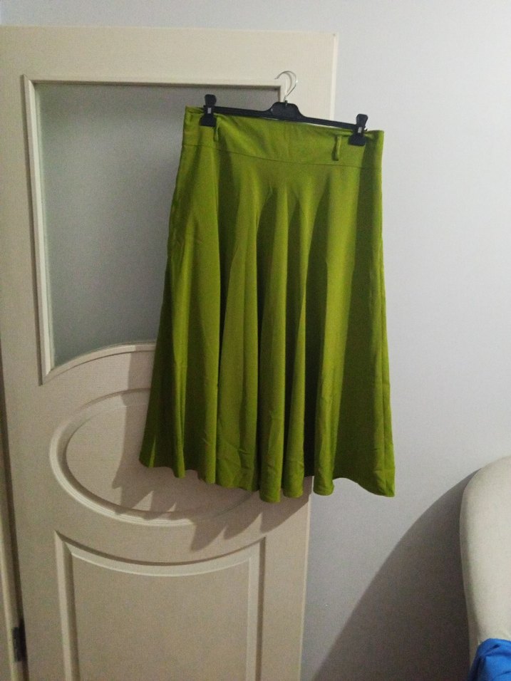 Yeşil, piliseli midi etek, bol kesim ve parlak, ipeksi kumaştan yapılmıştır. Günlük kullanıma uygun minimal tarzda.