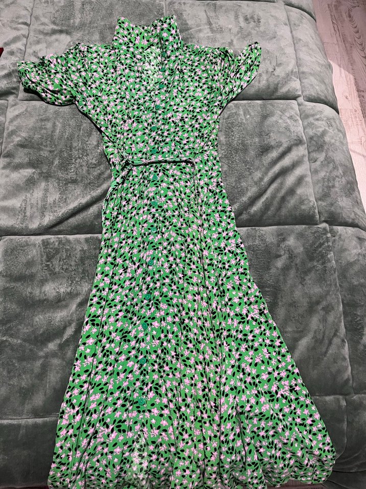 Sentetik kumaştan yapılmış, piliseli ve bağlama desenli uzun yeşil elbise. V yaka, kısa kollu ve vücuda oturan kesime sahiptir.