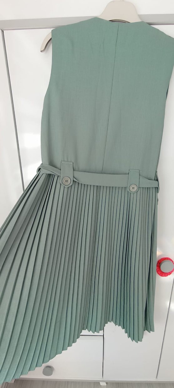 Yeşil renkte, piliseli etekli, yakası kesimli uzun kadın elbisesi. Sentetik kumaştan, regular fit ve askılı kollu, modern klasik tarzda. Günlük kullanıma uygun.